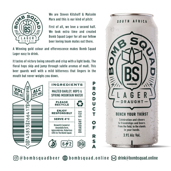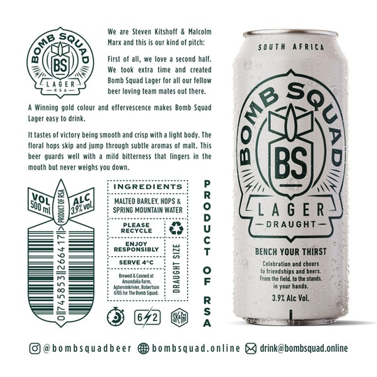 A Winning gold colour and effervescence makes Bomb Squad Lager easy to drink.